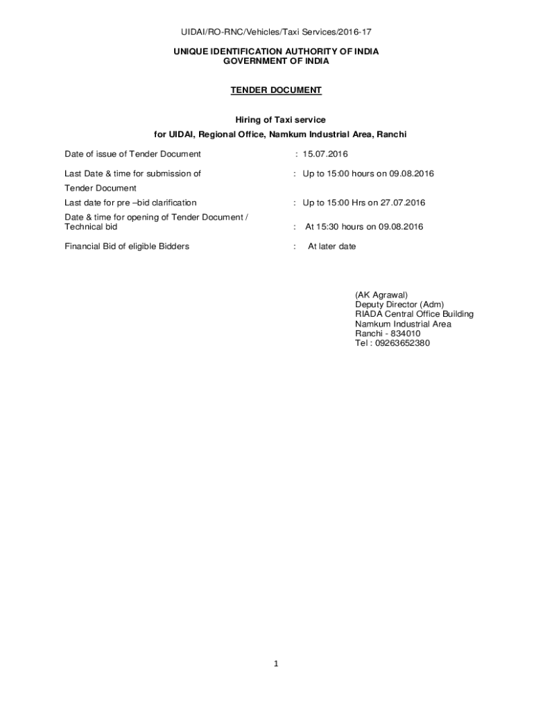 UI DAI/ROR NC/Vehicles/Taxi Services/201617 UNIQUE IDENTIFICATION AUTHORITY OF INDIA GOVERNMENT OF INDIATENDER Documenting of Taxi service for UI DAI, Regional Office, Wampum Industrial Area, Ranchi