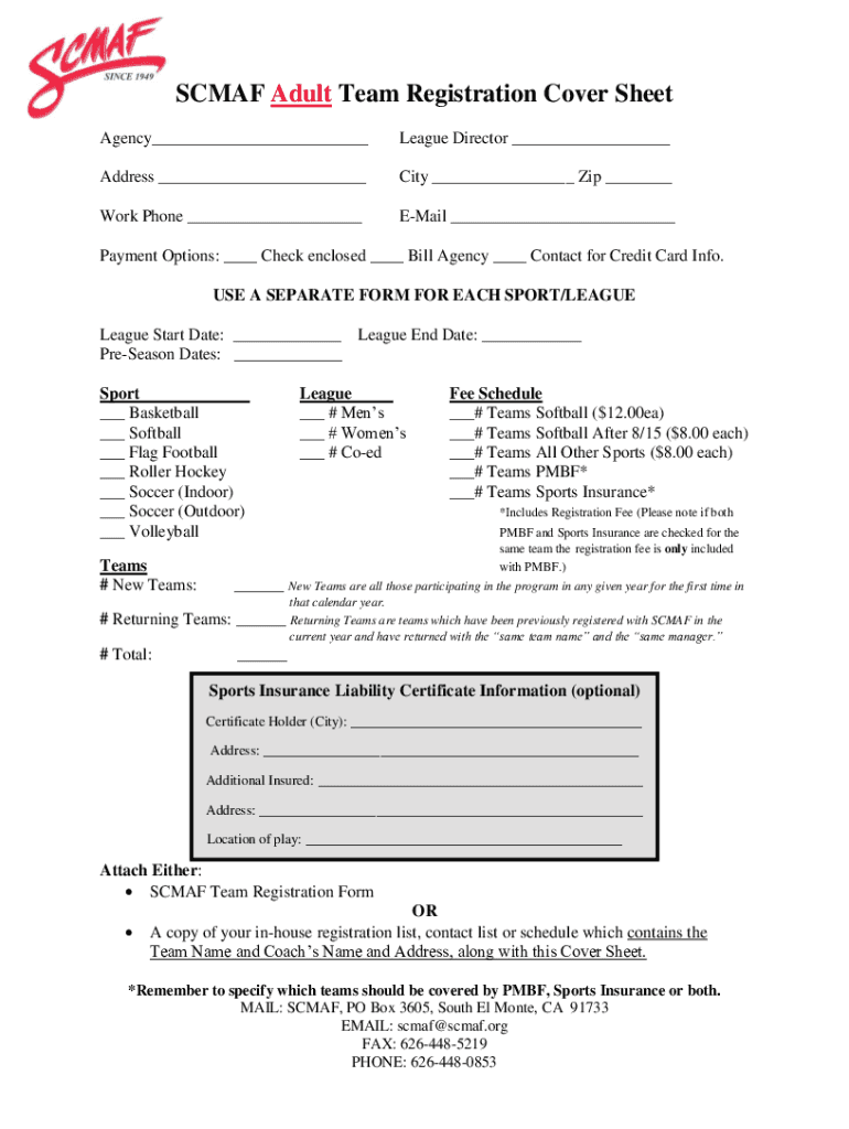 SC MAF Adult Team Registration Cover Sheet Agency___League Director ___Address ___City ___ Zip ___Work Phone ___Email ___Payment Options: ___ Check enclosed ___ Bill Agency ___ Contact for Credit