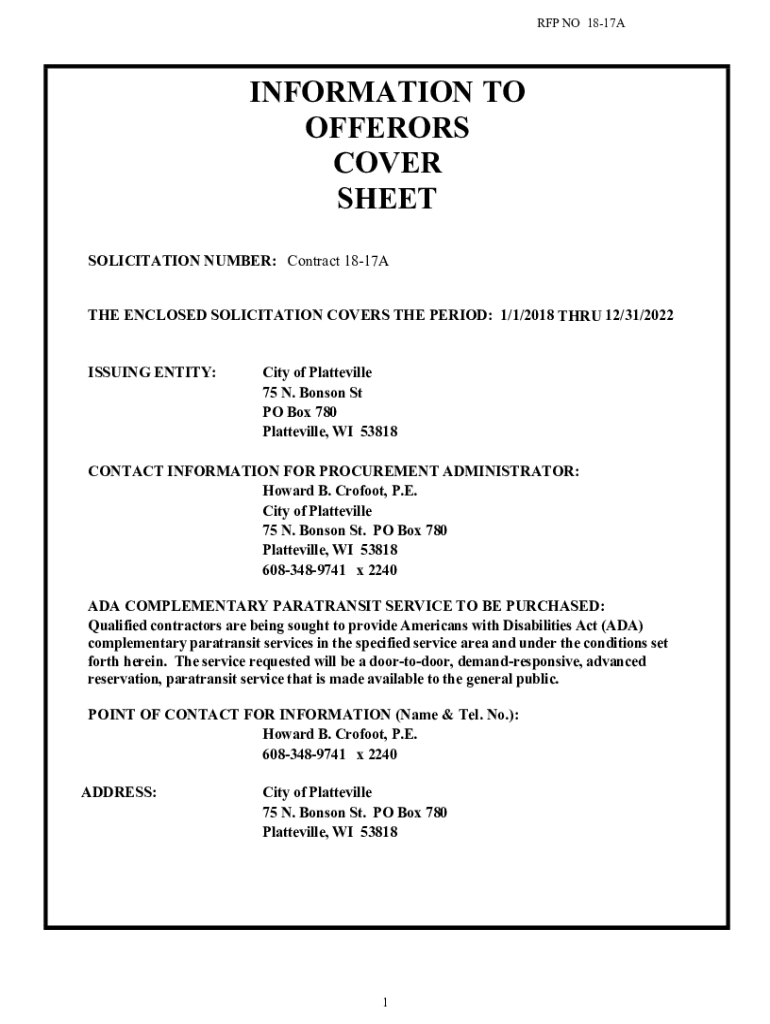 RFP NO 1817AINFORMATION TO OFFER ORS COVER SHEET SOLICITATION NUMBER: Contract 1817A THE ENCLOSED SOLICITATION COVERS THE PERIOD: 1/1/2018 Through 12/31/2022ISSUING ENTITY:City of Prattville 75 N.