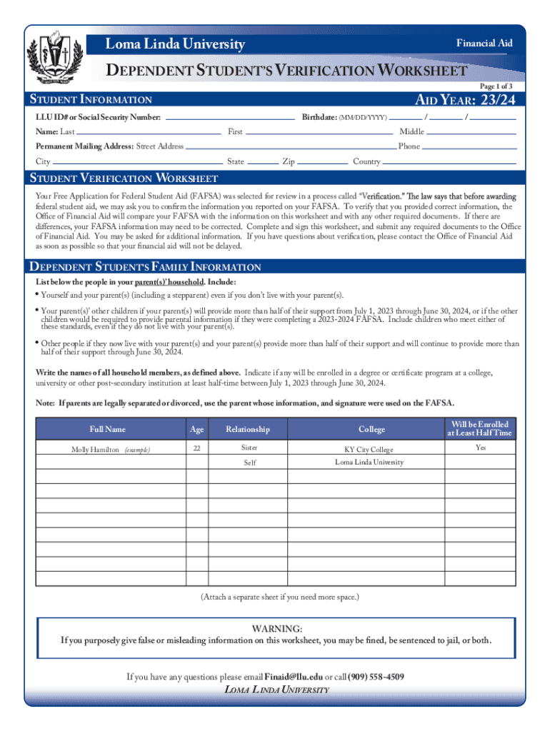 Coma Linda UniversityFinancial Independent STUDENTS VERIFICATION WORKSHEETSTUDENT INFORMATION AID YEAR: 23/24Birthdate: (MM/DD/YYY)FLU ID# or Social Security Number: Name: LastFirstPage 1 of 3//MiddlePermanent