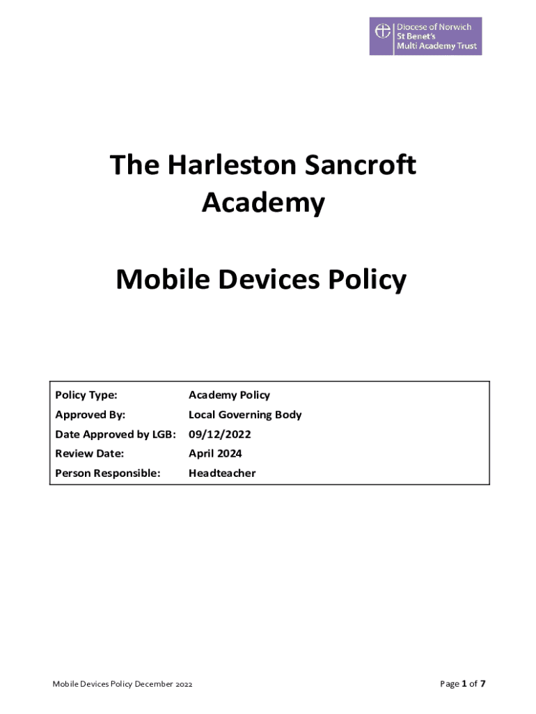 The Charleston Bancroft Academy Mobile Devices PolicyPolicy Type:Academy PolicyApproved By:Local Governing Moderate Approved by LAB:09/12/2022Review Date:April 2024Person Responsible:Headteacher Mobile
