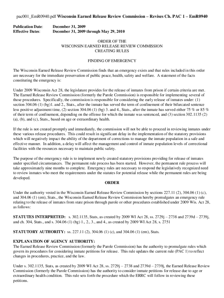 Pac001_EmR0940.pdf Wisconsin Earned Release Review Commission Revises Ch. PAC 1 EmR0940 Publication Date: Effective Dates:December 31, 2009, December 31, 2009, through May 29, 2010, ORDER OF THE WISCONSIN