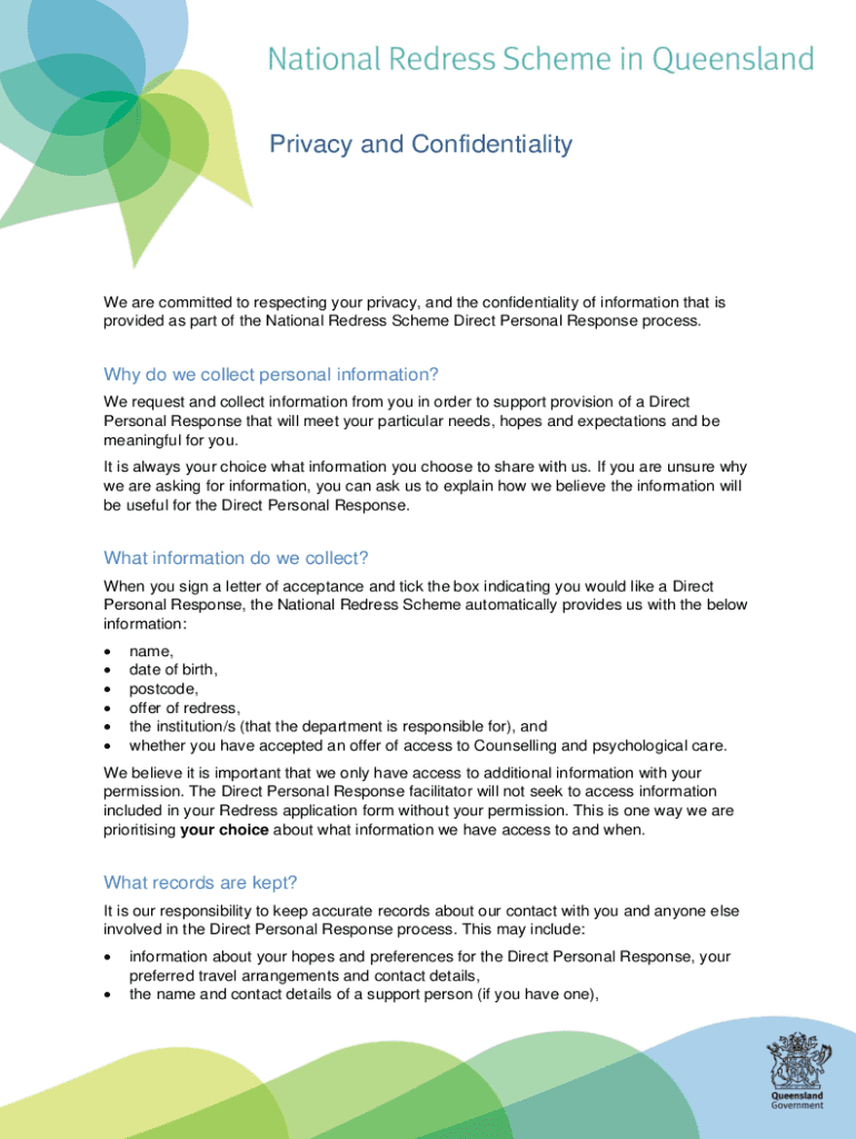 Get the free National Redress Scheme in Queensland Privacy and Confidentiality Information Sheet....
