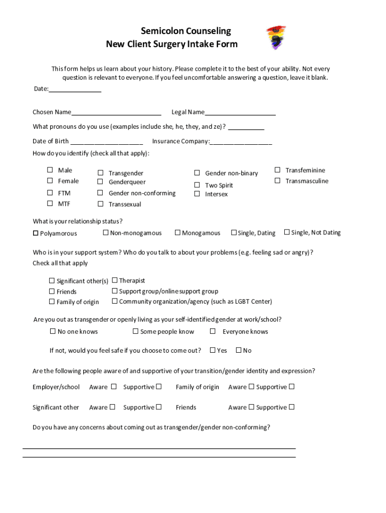 Semicolon Counseling New Client Surgery Intake Form This form helps us learn about your history. Please complete it to the best of your ability. Not every question is relevant to everyone. If you