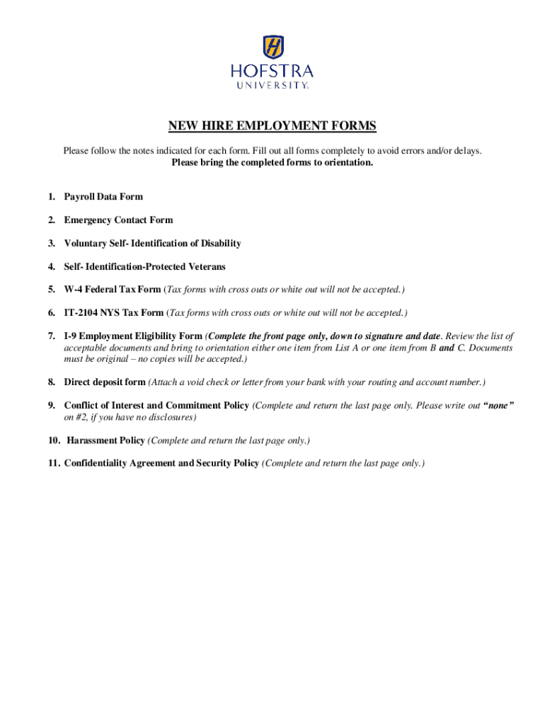 NEW HIRE EMPLOYMENT FORMS Please follow the notes indicated for each form. Fill out all forms completely to avoid errors and/or delays. Please bring the completed forms to orientation.1. Payroll Data