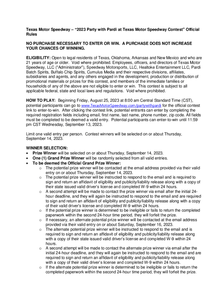 Texas Motor Speedway 2023 Party with Padi at Texas Motor Speedway Contest Official Rules NO PURCHASE NECESSARY TO ENTER OR WIN. A PURCHASE DOES NOT INCREASE YOUR CHANCES OF WINNING. ELIGIBILITY: Open