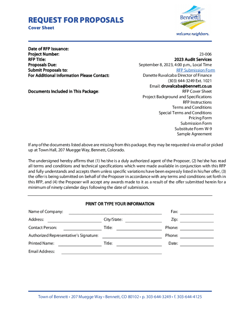REQUEST FOR PROPOSALS Cover Sedate of RFP Issuance: Project Number: RFP Title: Proposals Due: Submit Proposals to: For Additional Information Please Contact: Documents Included in This Package:23006
