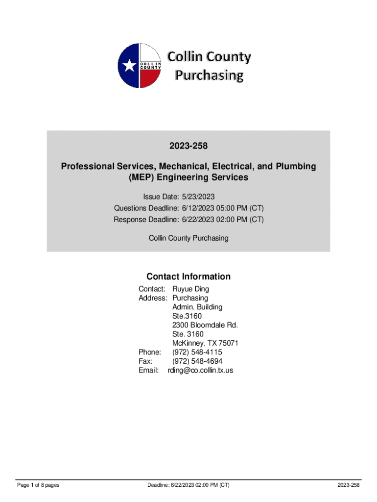 2023258 Professional Services, Mechanical, Electrical, and Plumbing (MEP) Engineering Services Issue Date: 5/23/2023 Questions Deadline: 6/12/2023 05:00 PM (CT) Response Deadline: 6/22/2023 02:00