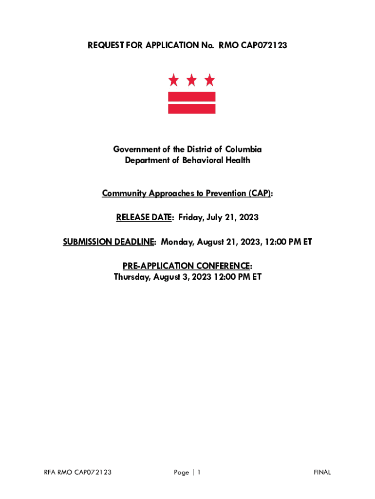 REQUEST FOR APPLICATION No. RIO CAP072123Government of the District of Columbia Department of Behavioral Health Community Approaches to Prevention (CAP): RELEASE DATE: Friday, July 21, 2023, SUBMISSION