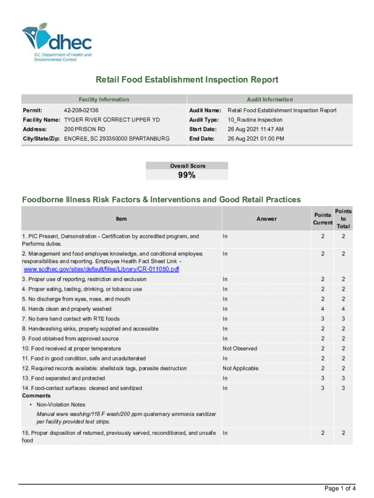 Permit:Audit Information4220802136Audit Name:Retail Food Establishment Inspection ReportFacility Name: TYLER RIVER CORRECT UPPER Audit
