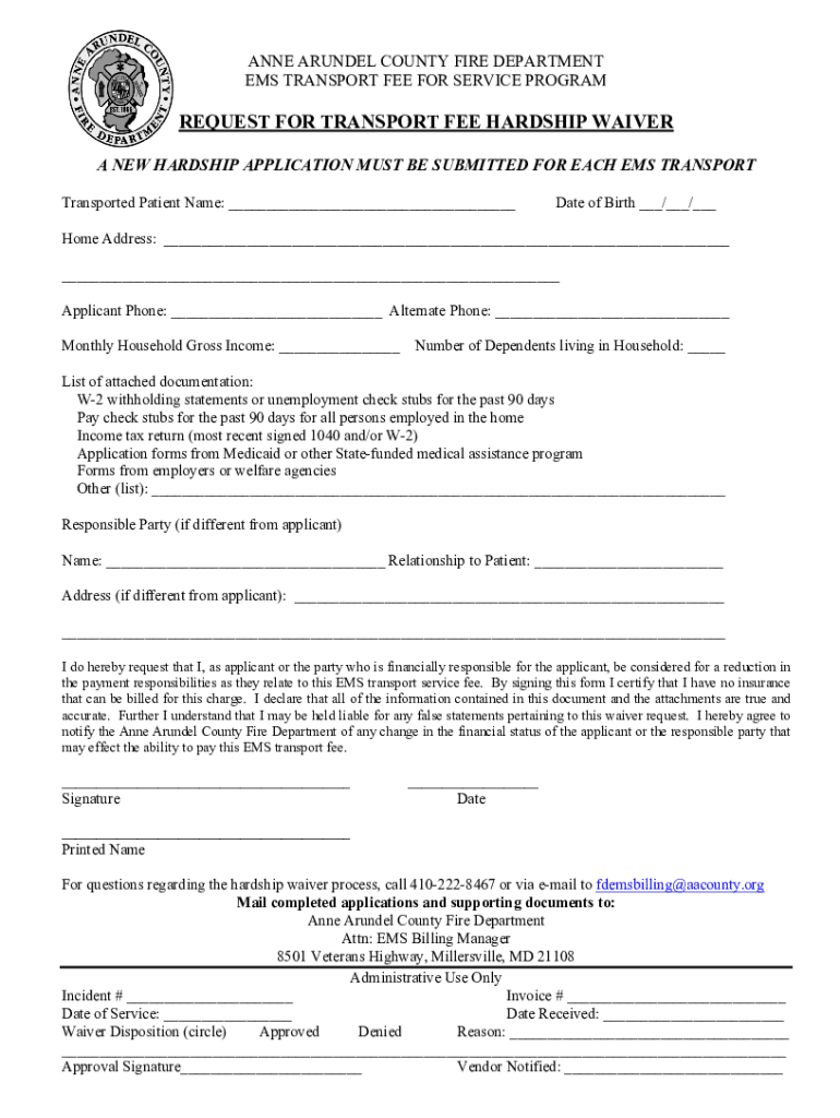 ANNE ARUNDEL COUNTY FIRE DEPARTMENT EMS TRANSPORT FEE FOR SERVICE PROGRAMREQUEST FOR TRANSPORT FEE HARDSHIP WAIVER A NEW HARDSHIP APPLICATION MUST BE SUBMITTED FOR EACH EMS TRANSPORT Transported Patient