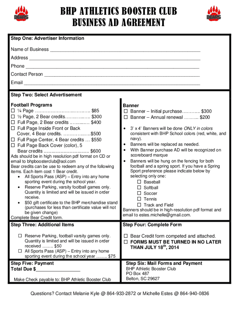 BHP ATHLETICS BOOSTER CLUB BUSINESS AD AGREEMENT Step One: Advertiser Information Name of Business ___ Address ___ Phone ___ Contact Person ___ Email ___ Step Two: Select Advertisement Football Programs