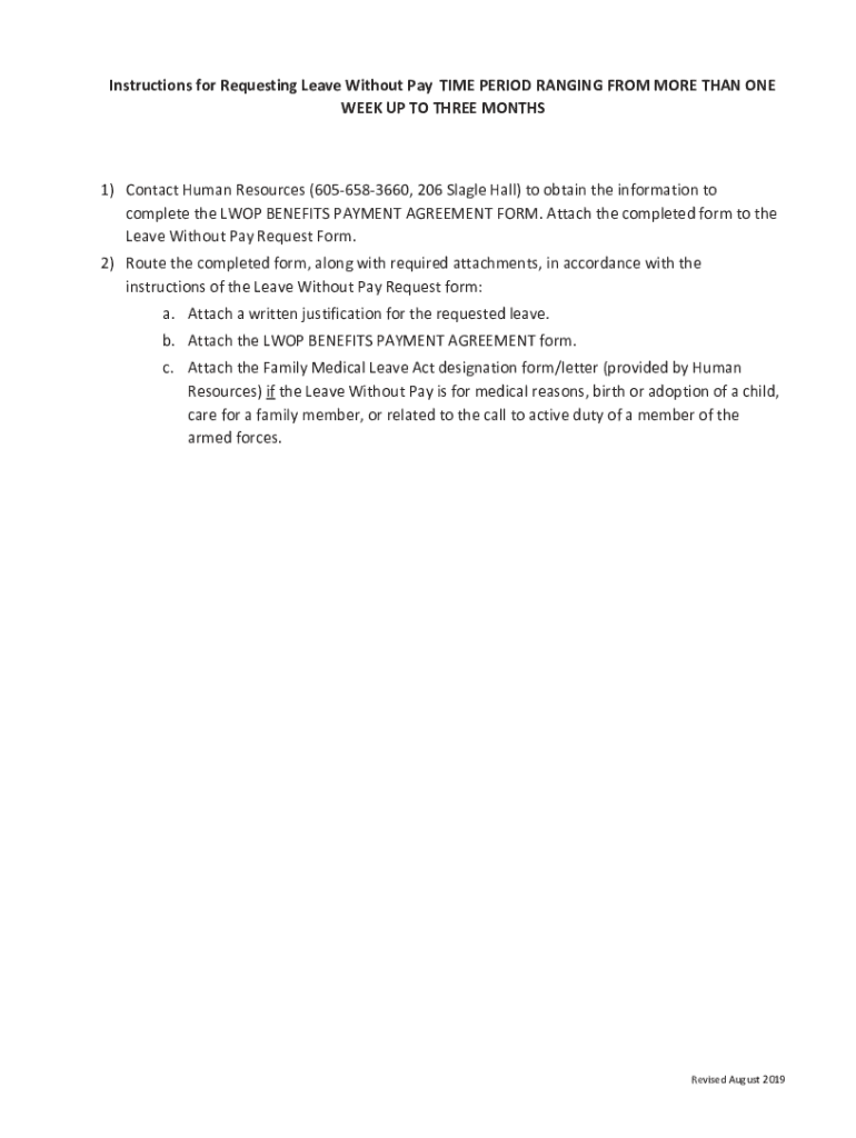 Instructions for Requesting Leave Without Pay TIME PERIOD RANGING FROM MORE THAN ONE WEEK UP TO THREE MONTHS1) Contact Human Resources (6056583660, 206 Single Hall) to obtain the information to complete
