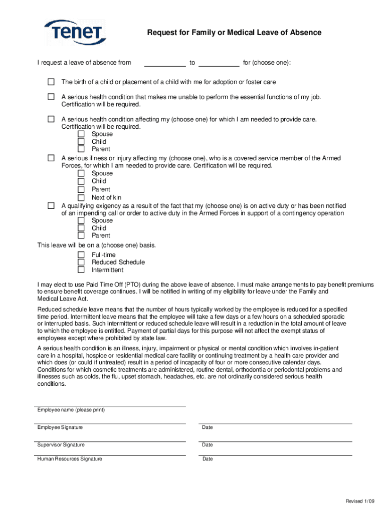 Request for Family or Medical Leave of Absence request a leave of absence fromtofor (choose one):The birth of a child or placement of a child with me for adoption or foster care A serious health condition
