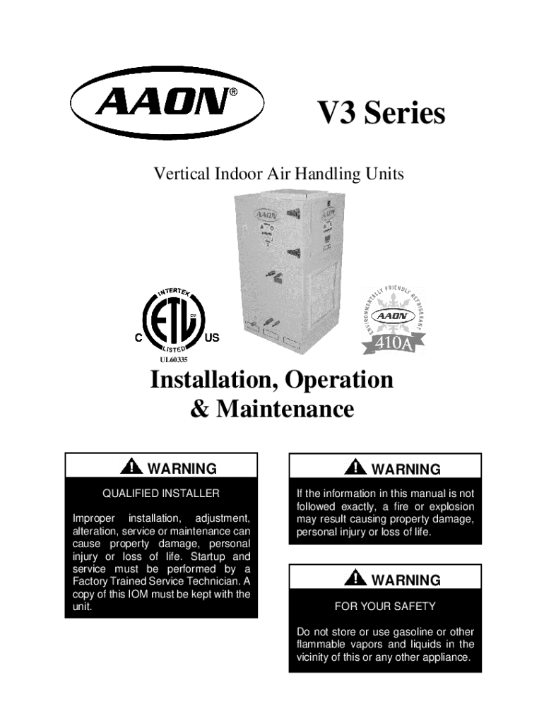V3 Series Vertical Indoor Air Handling UnitsUL60335Installation, Operation & Maintenance WARNING QUALIFIED INSTALLER Improper installation, adjustment, alteration, service or maintenance can cause