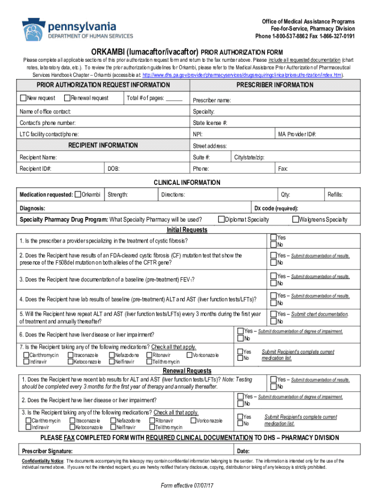 Office of Medical Assistance Programs FeeforService, Pharmacy Division Phone 18005378862 Fax 18663270191ORKAMBI (lumacaftor/ivacaftor) PRIOR AUTHORIZATION FORM Please complete all applicable sections