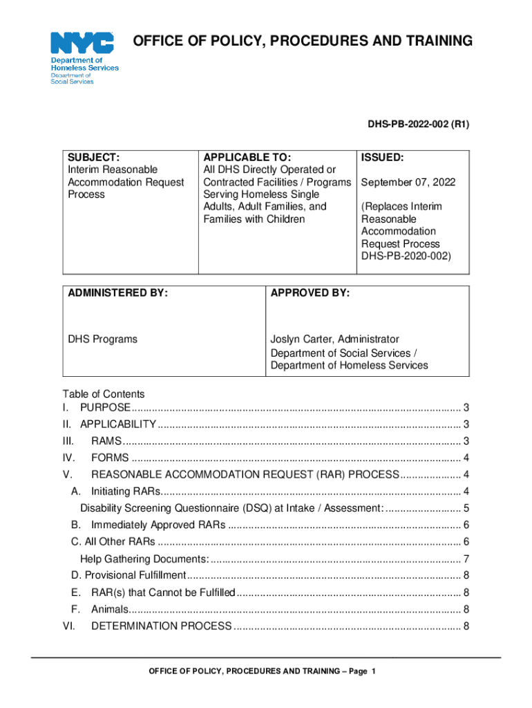 OFFICE OF POLICY, PROCEDURES AND TRAININGDHSPB2022002 (R1)SUBJECT: Interim Reasonable Accommodation Request ProcessAPPLICABLE TO: All DHS Directly Operated or Contracted Facilities / Programs Serving