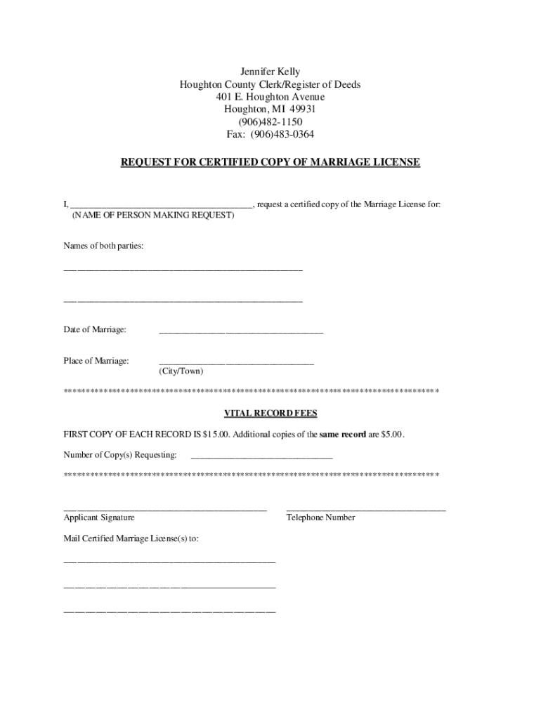 Jennifer Kelly Houghton County Clerk/Register of Deeds 401 E. Houghton Avenue Houghton, MI 49931 (906)4821150 Fax: (906)4830364 REQUEST FOR CERTIFIED COPY OF MARRIAGE LICENSE, ___, request a certified