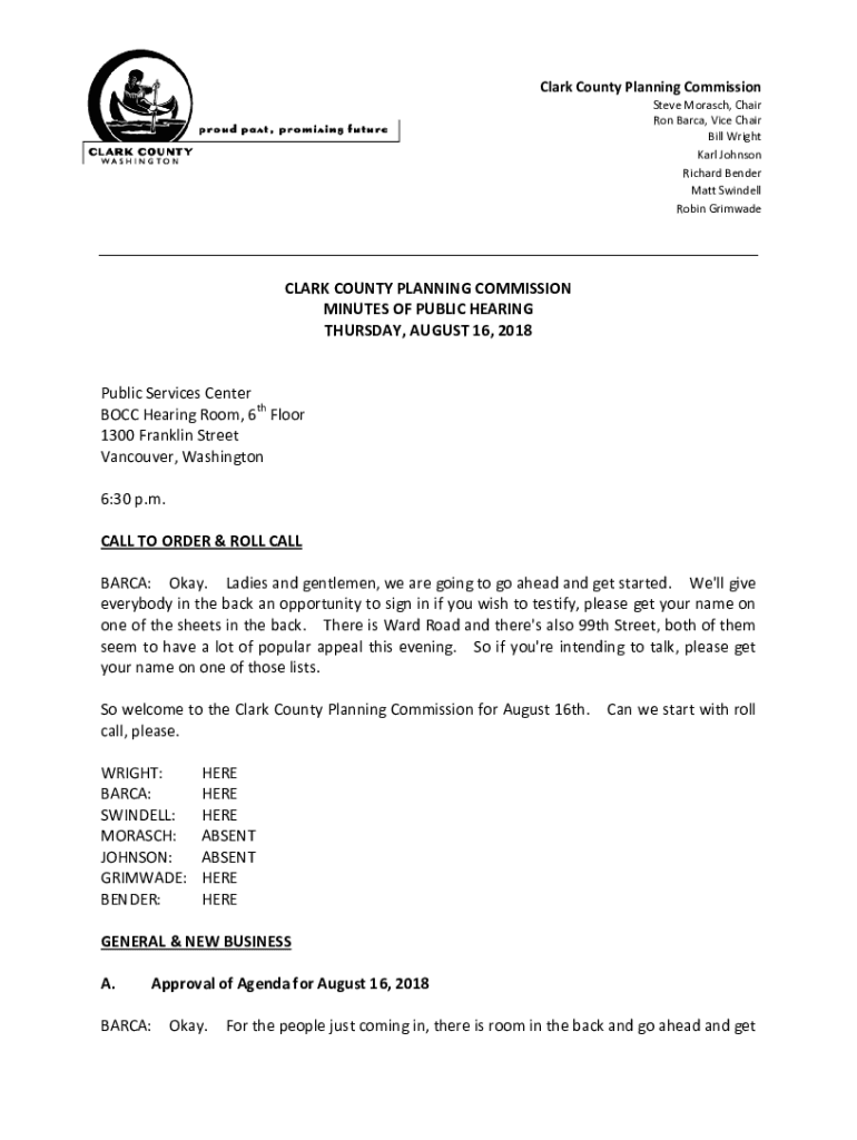 Clark County Planning Commission Steve Moreish, Chair Ron Barça, Vice Chair Bill Wright Karl Johnson Richard Bender Matt Wendell Robin GrimwadeCLARK COUNTY PLANNING COMMISSION MINUTES OF PUBLIC HEARING
