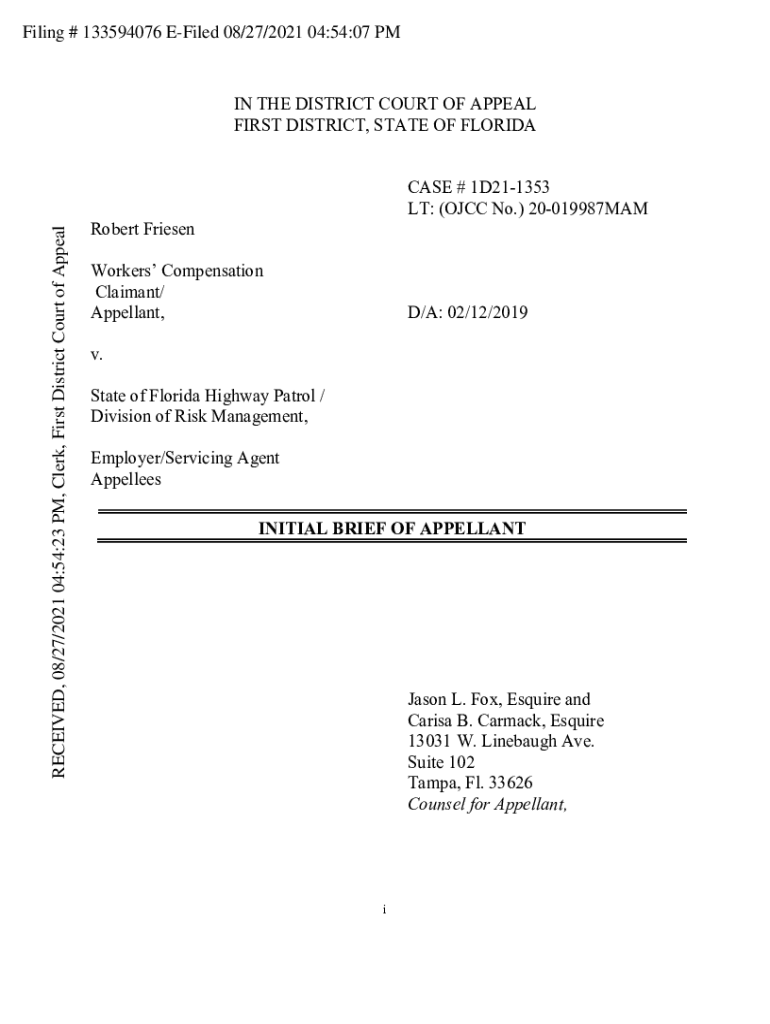 Filing # 133594076 Filed 08/27/2021 04:54:07 RECEIVED, 08/27/2021 04:54:23 PM, Clerk, First District Court of Appealing THE DISTRICT COURT OF APPEAL FIRST DISTRICT, STATE OF FLORIDA CASE # 1D211353
