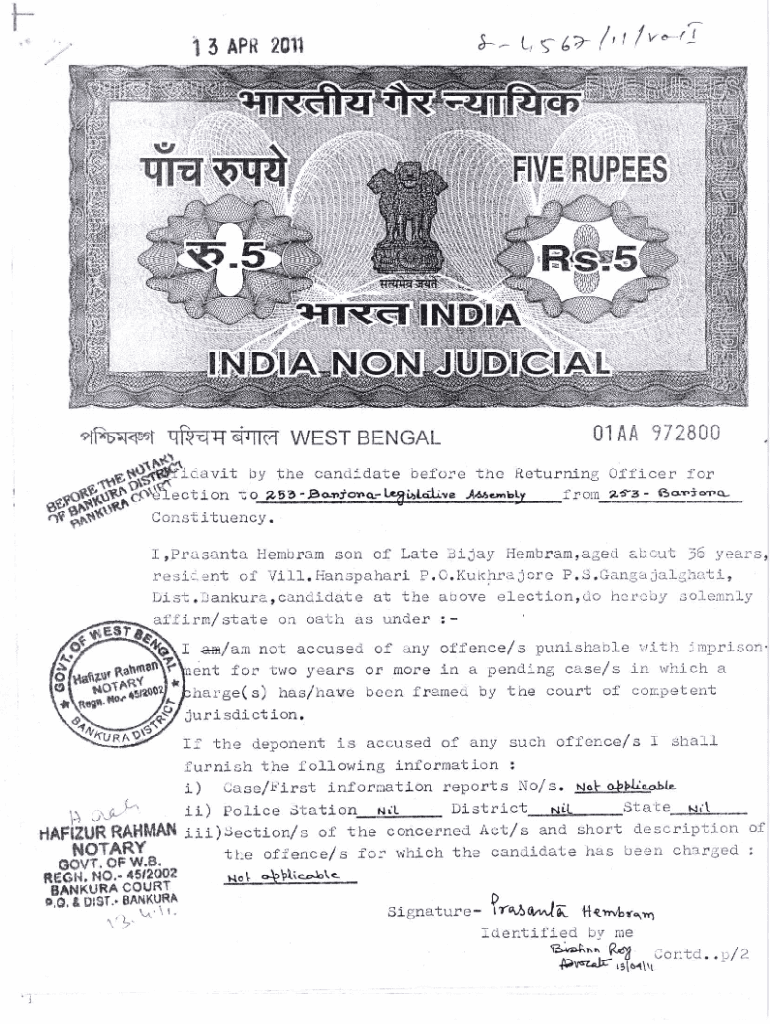 T1 3 APR 20119tP55\'TGI II c1WEST BENGALr1/1/001 AA 972800,14 davits by the candidate before the Returning Officer for from 26.3 over c)P Golgi!election to 255. Pandora. liettiArdive Assembly Constituency.