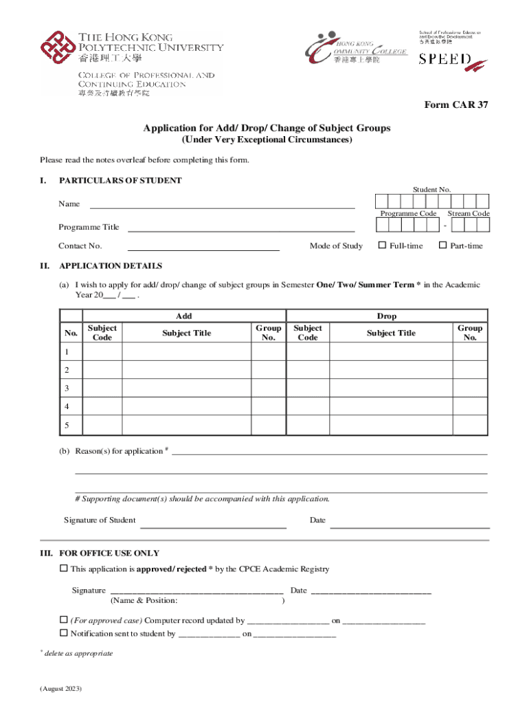Get the free Form CAR 37 Application for Add/ Drop/ Change of Subject ...