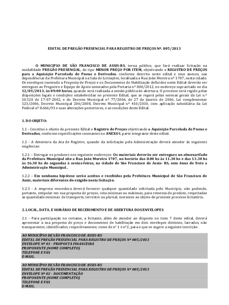Obtenha o gratuito edital de prego presencial para registro de preos n 005/ ...