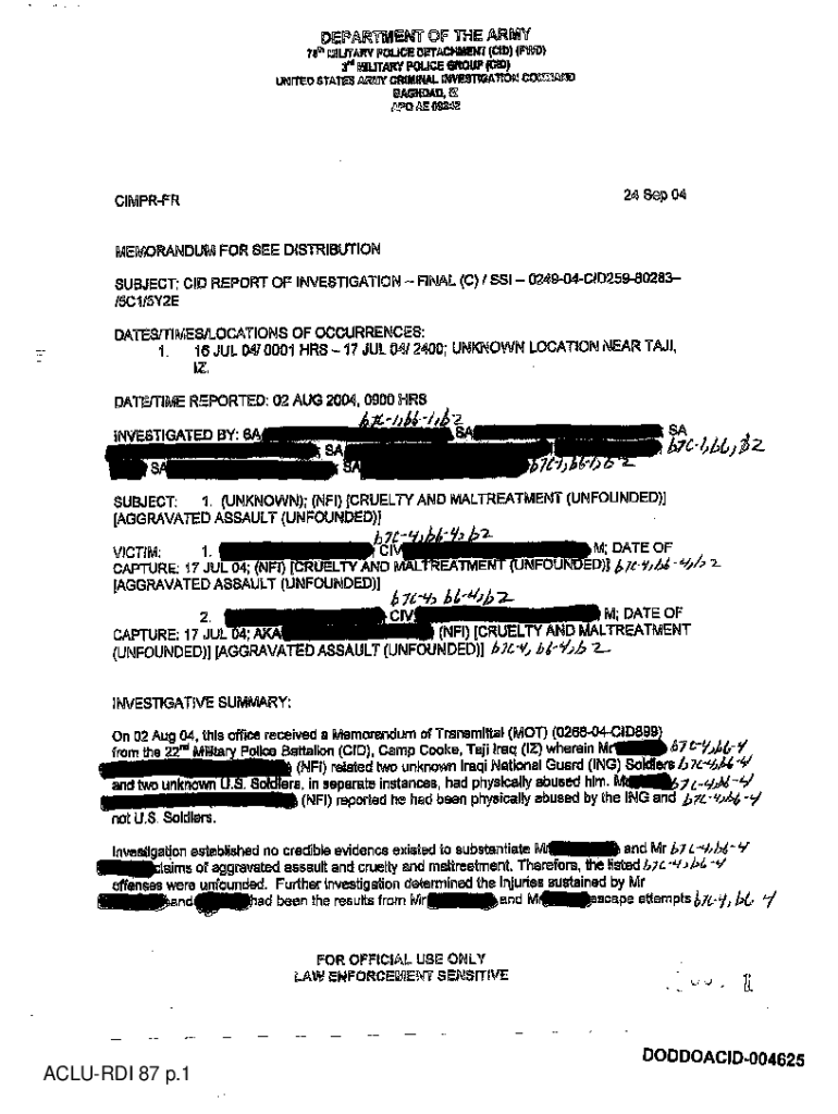 DEP TINIEST 11F THE ARMY 782, LIBRARY POLICE DETACHISSIT (CID) (Ply)34 MILITARY POLICE GROUP (CID)UNITED STATES ARMY CRIMINAL INVESTIGATION COMMAND BAGHDAD, E AE 6924 Sep 04CIMPRFR MEMORANDUM FOR
