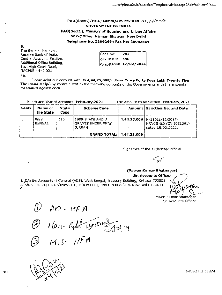 Https://pfrns.NIC.inlSanctionlTemplateAdvice.aspx ? AdviceNumLbc...PAO(Sect.)/HUB/Ad min /Advice/202021// /? GOVERNMENT OF INDIA PAO(Sect.), Ministry of Housing and Urban Affairs 507C Wing, Norman