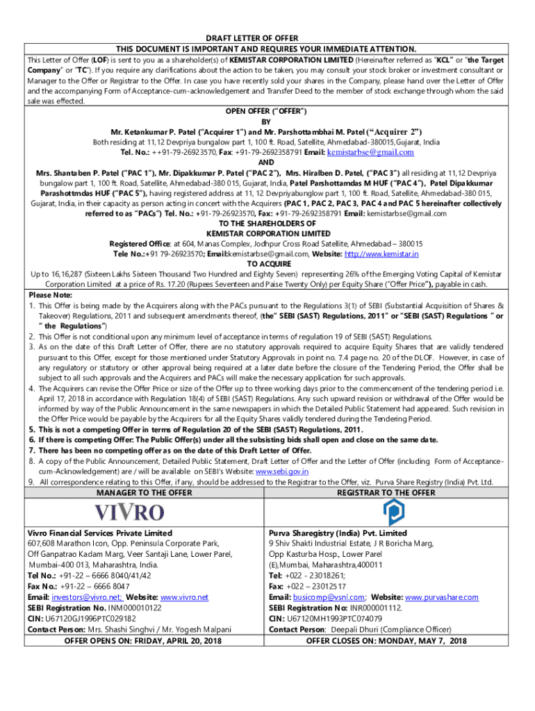 DRAFT LETTER OF OFFER THIS DOCUMENT IS IMPORTANT AND REQUIRES YOUR IMMEDIATE ATTENTION. This Letter of Offer (LOF) is sent to you as a shareholder(s) of DEMISTER CORPORATION LIMITED (Hereinafter referred