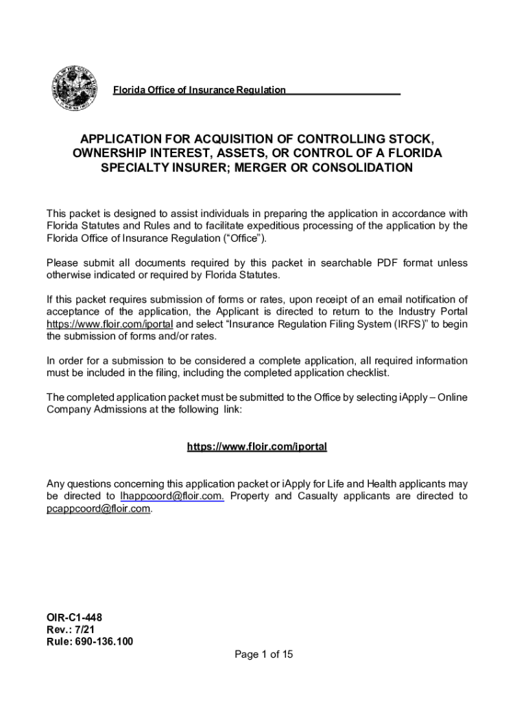 Florida Office of Insurance RegulationAPPLICATION FOR ACQUISITION OF CONTROLLING STOCK, OWNERSHIP INTEREST, ASSETS, OR CONTROL OF A FLORIDA SPECIALTY INSURER; MERGER OR CONSOLIDATION This packet is