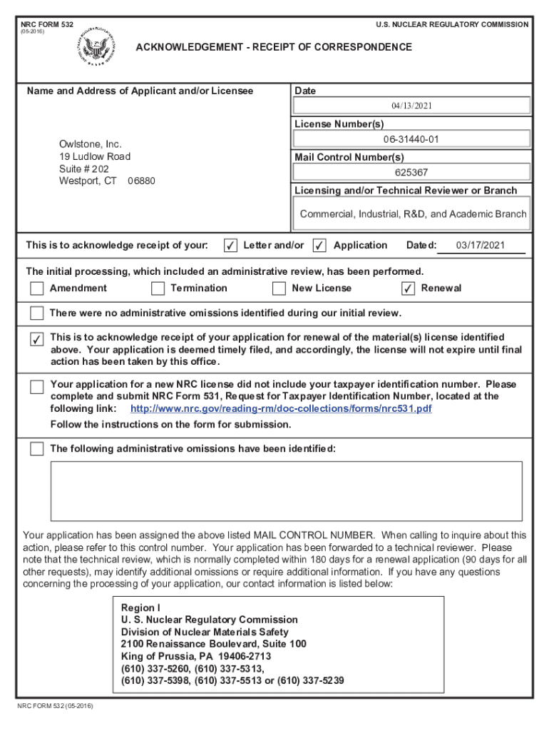 NRC FORM 532U. S. NUCLEAR REGULATORY COMMISSION(052016)ACKNOWLEDGEMENT RECEIPT OF CORRESPONDENCEName and Address of Applicant and/or LicenseeDate