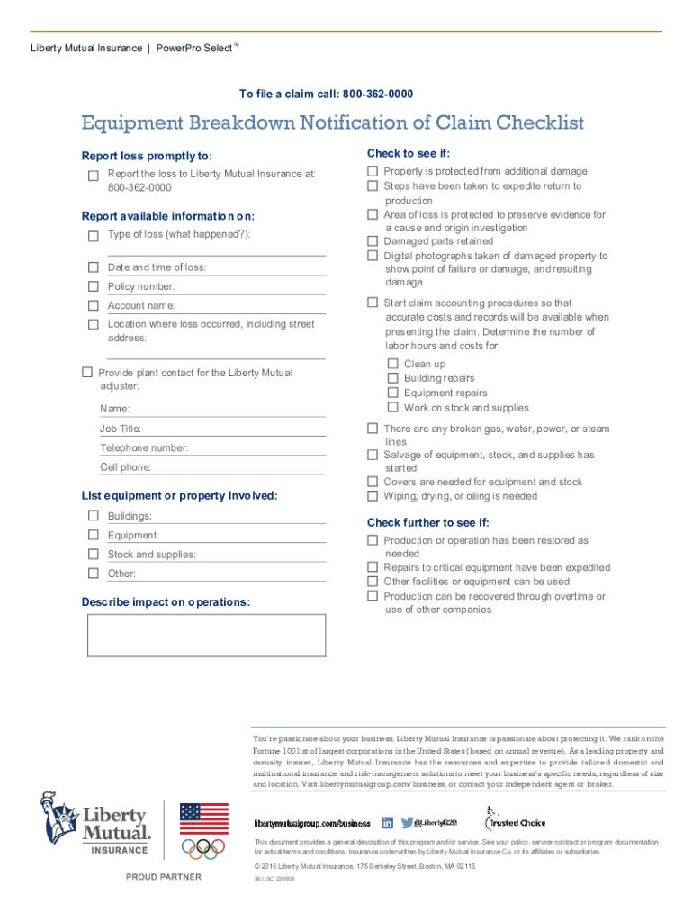 Liberty Mutual Insurance | PowerPC Selected file a claim call: 8003620000Equipment Breakdown Notification of Claim Checklist Check to see if:Report loss promptly to: Report the loss to Liberty Mutual