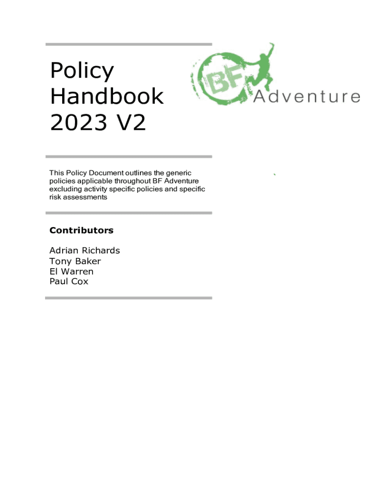 Policy Handbook 2023 V2 This Policy Document outlines the generic policies applicable throughout BF Adventure excluding activity specific policies and specific risk assessmentsContributors Adrian