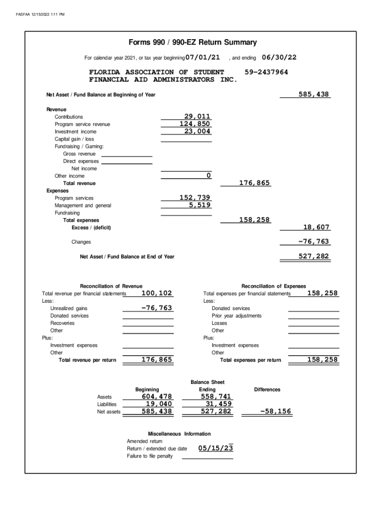 FASCIA 12/15/2022 1:11 Forms 990 / 990EZ Return Summary For calendar year 2021, or tax year beginning 07/01/21, and ending06/30/22FLORIDA ASSOCIATION OF STUDENT 592437964 FINANCIAL AID ADMINISTRATORS