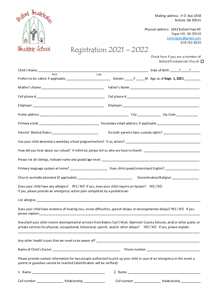 Obtain a registration form from Buford Presbyterian Weekday School.