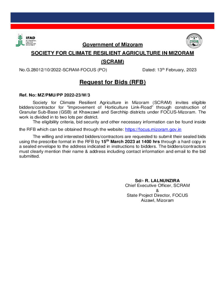 Government of Mizoram SOCIETY FOR CLIMATE RESILIENT AGRICULTURE IN MIZORAM (SCRAM) No. G.28012/10/2022SCRAMFOCUS (PO)Dated: 13th February, 2023Request for Bids (ROB) Ref. No: MZ/PMU/PP 202223/W/3