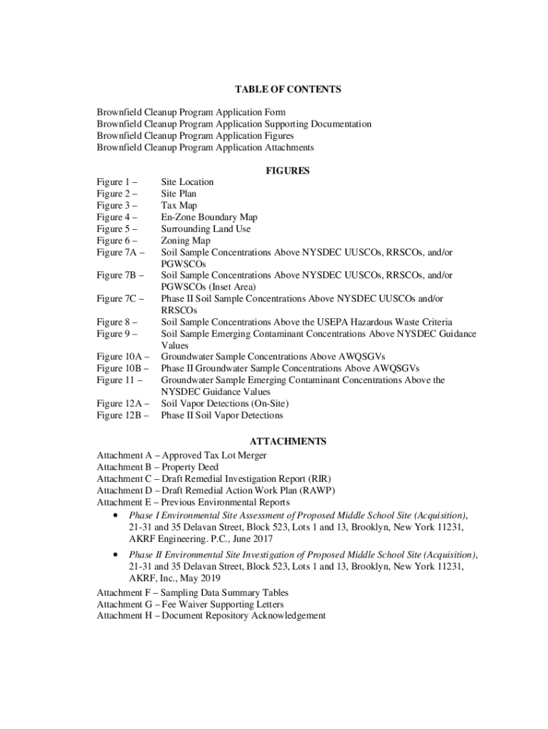 TABLE OF CONTENTS Brownfield Cleanup Program Application Form Brownfield Cleanup Program Application Supporting Documentation Brownfield Cleanup Program Application Figures Brownfield Cleanup Program