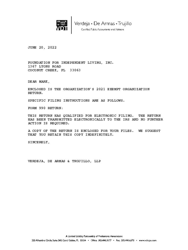 JUNE 20, 2022FOUNDATION FOR INDEPENDENT LIVING, INC. 1367 LYONS ROAD COCONUT CREEK, FL 33063 DEAR MARK, ENCLOSED IS THE ORGANIZATION\'S 2021 EXEMPT ORGANIZATION RETURN. SPECIFIC FILING INSTRUCTIONS