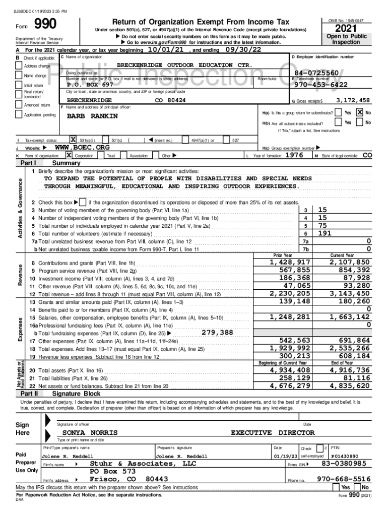 Breckenridge Outdoor Education Center is required to file annual reports with the appropriate regulatory agencies as a non-profit organization.