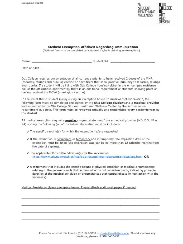 Last updated: 6/5/2023Medical Exemption Affidavit Regarding Immunization (Optional form to be completed by a student if s/he is claiming an exemption.) Name: ___ Student X#: ___ Date of Birth: ___Otis