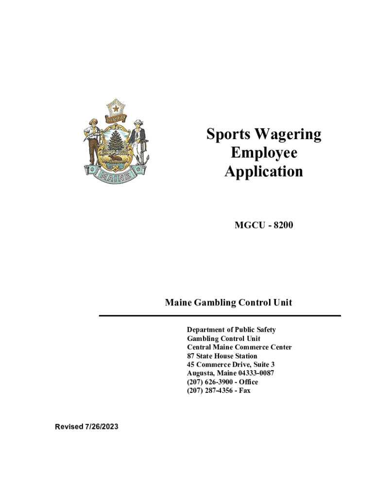 Sports Wagering Employee Application MCU 8200Maine Gambling Control Unit___ Department of Public Safety Gambling Control Unit Central Maine Commerce Center 87 State House Station 45 Commerce Drive,