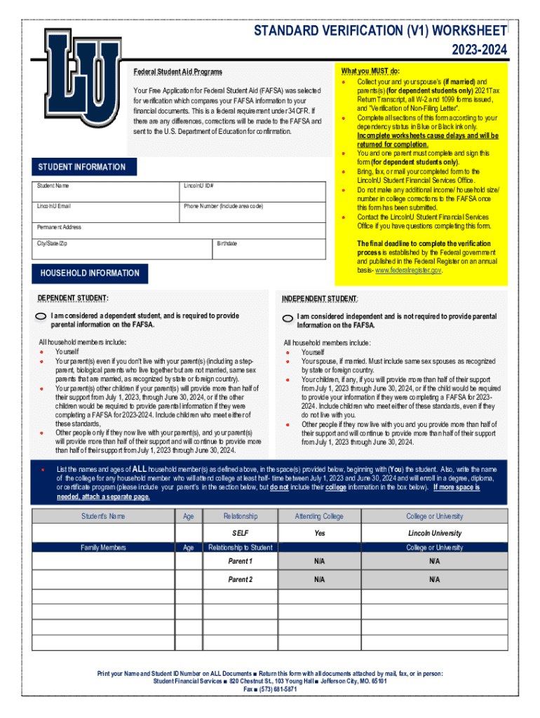 STANDARD VERIFICATION (V1) WORKSHEET 20232024 Federal Student Aid Programs Your Free Application for Federal Student Aid (FAFSA) was selected for verification which compares your FAFSA information
