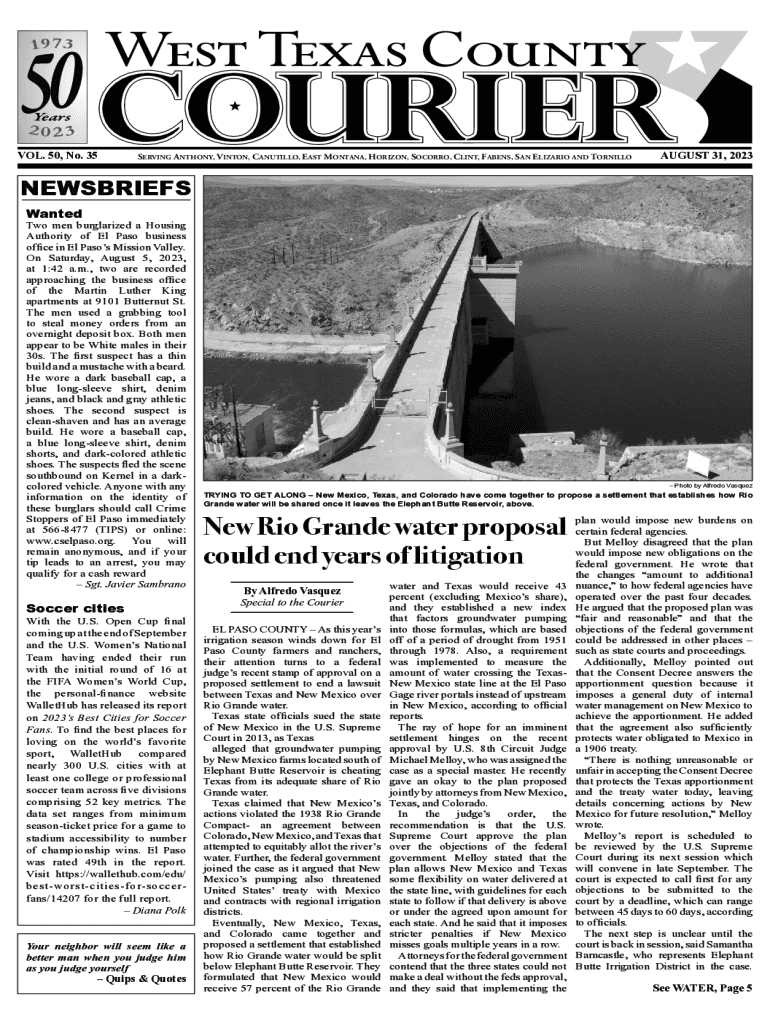 1973Years2023VOL. 50, No. 35SERVING ANTHONY, HINTON, CASTILLO, EAST MONTANA, HORIZON, SOCORRO, CLINT, FAB ENS, SAN LIZARD AND TORNILLOAUGUST 31, 2023NEWSBRIEFS
