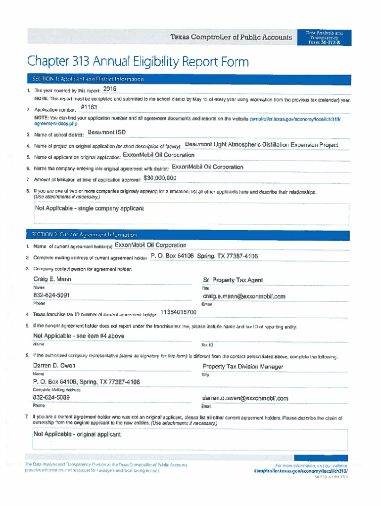 Texas Comptroller of Public Accounts:Ila Analysis and:1nsparcncy form 50772AChapter 313 Annual Eligibility Report Form SECTION 1: Applicant and District Information 1. Tax year covered by this report:2016___NOTE: