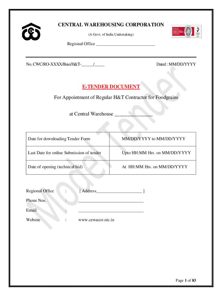 CENTRAL WAREHOUSING CORPORATION (A Govt. of India Undertaking)Regional Office ___No. CWC/ROXY/Bus/H&T___/___Dated : MM/DD/YYYYETENDER DOCUMENT For Appointment of Regular H&T Contractor for Food grains