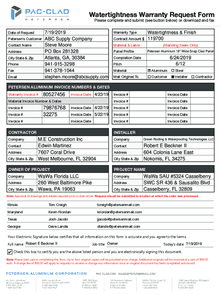 Water tightness Warranty Request Form Please complete and submit (see button below) or download and fax Warranty TypeFax7/19/2019 ABC Supply Company Steve Moore PO Box 281328 Atlanta, GA, 30384 9419153298