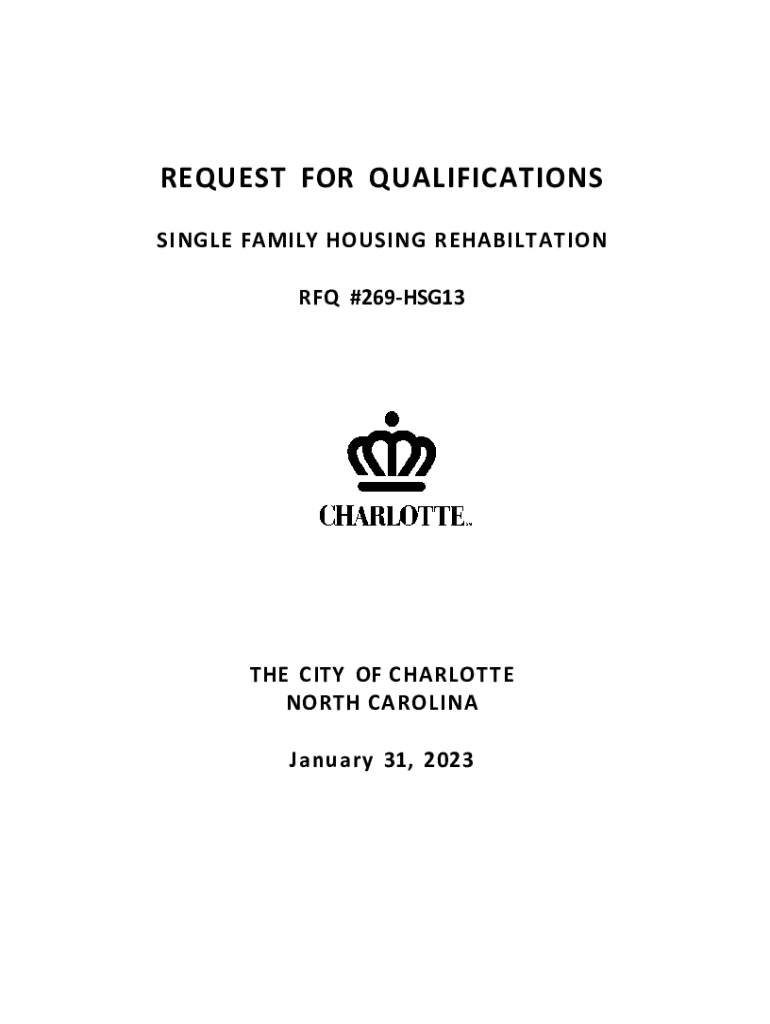 REQUEST FOR QUALIFICATIONS SINGLE FAMILY HOUSING REHABILITATION RFQ #269HSG13THE CITY OF CHARLOTTE NORTH CAROLINA January 31, 2023REQUEST FOR QUALIFICATIONS RFQ # 269HSG13 Single Family Housing Acquisition,