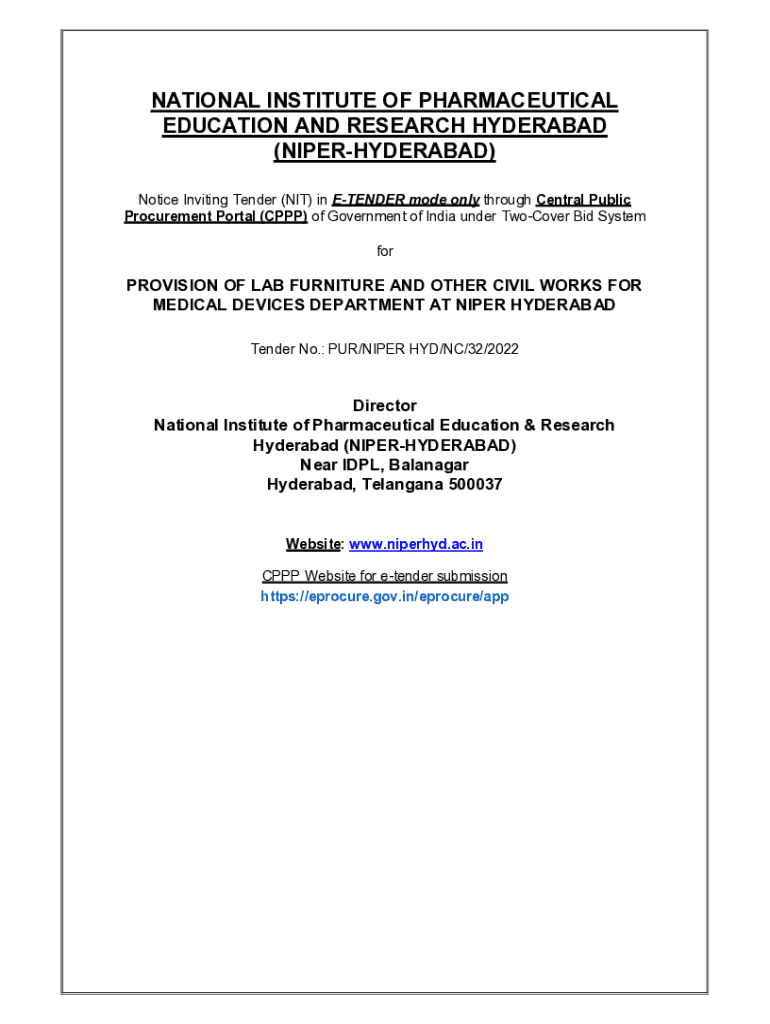 Notice Inviting Tender (NIT) in TENDER mode only through Central Public