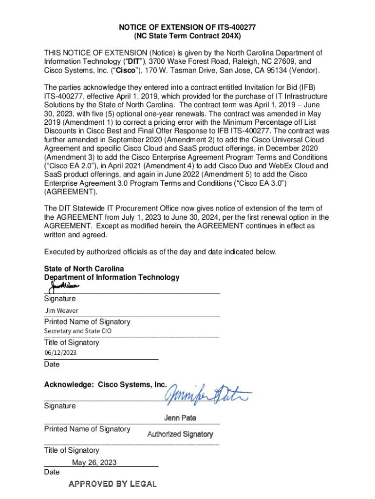 NOTICE OF EXTENSION OF ITS400277 (NC State Term Contract 204X) THIS NOTICE OF EXTENSION (Notice) is given by the North Carolina Department of Information Technology (IT), 3700 Wake Forest Road, Raleigh,